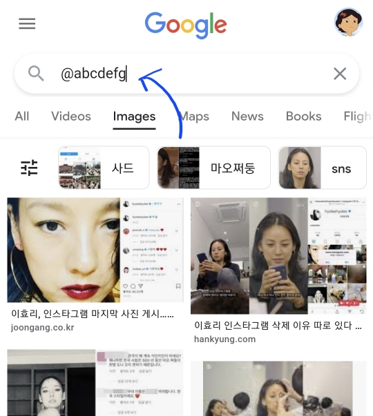 가장 첫 번째 방법으로는 구글 이미지 검색입니다. 먼저 구글에서 "@인스타그램 아이디"를 검색하고 이미지 탭으로 들어갑니다. 그러면 비공개로 전환하기 전 사진들이 뜨는 경우가 있습니다.