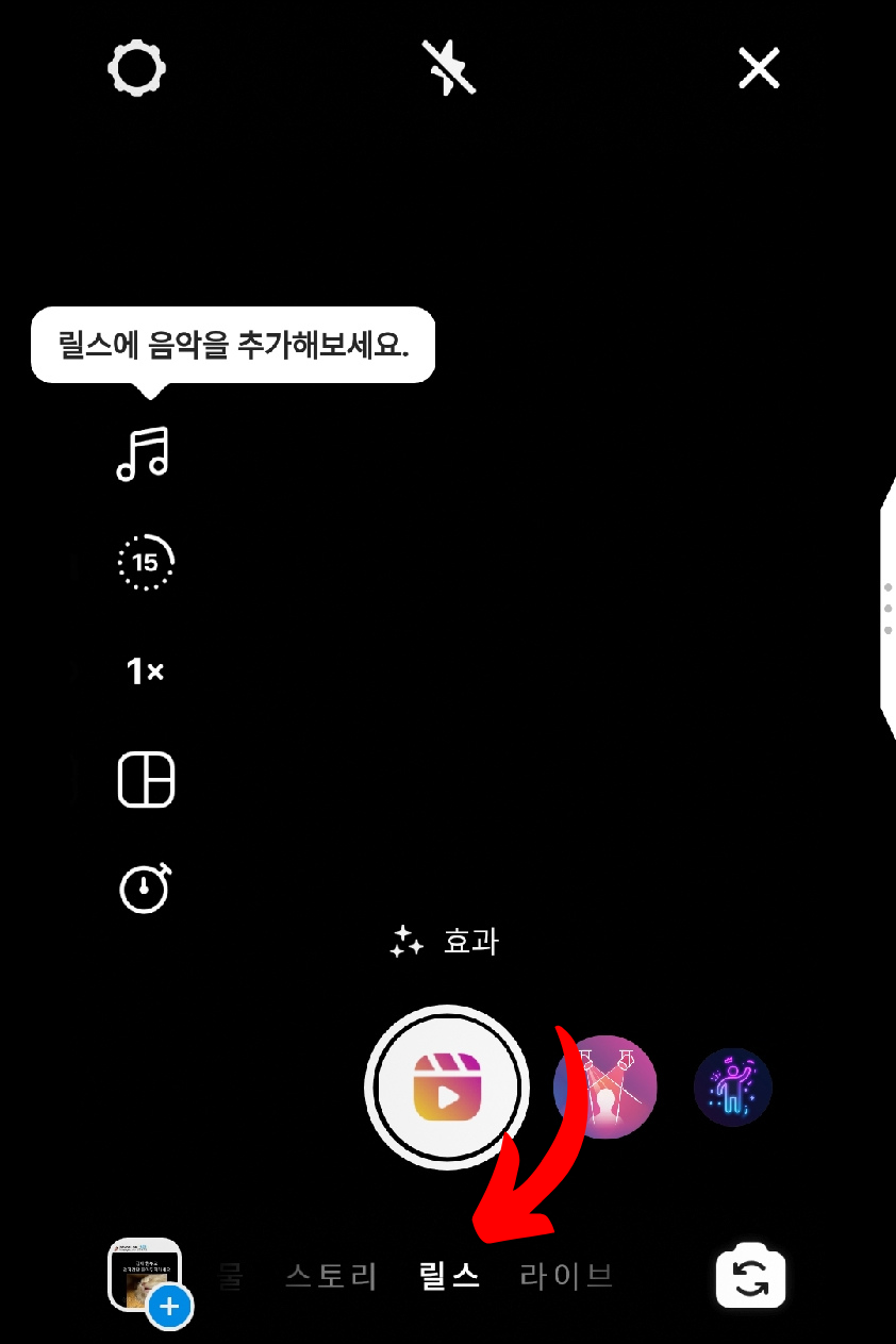 게시물 추가 화면으로 넘어갔다면 하단 메뉴 중에서 릴스를 클릭하면 릴스 영상 편집 화면을 볼 수 있습니다.