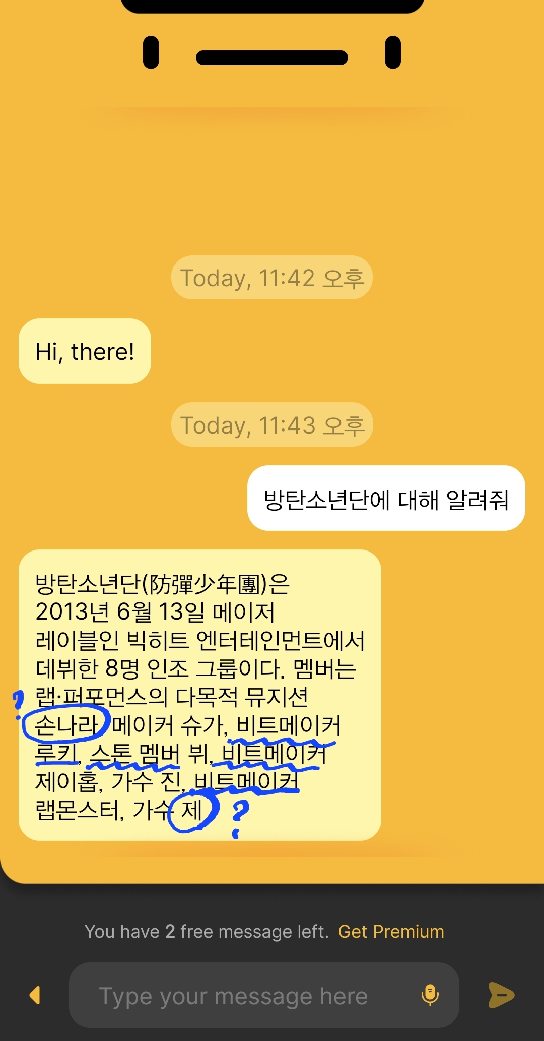 첫 번째 단점은 답변이 완벽하지 않다는 점입니다. 방탄소년단에 대해서 추가로 질문을 해 보았습니다. 마지막 부분을 보시면 아시겠지만 답변을 하다가 말았습니다.