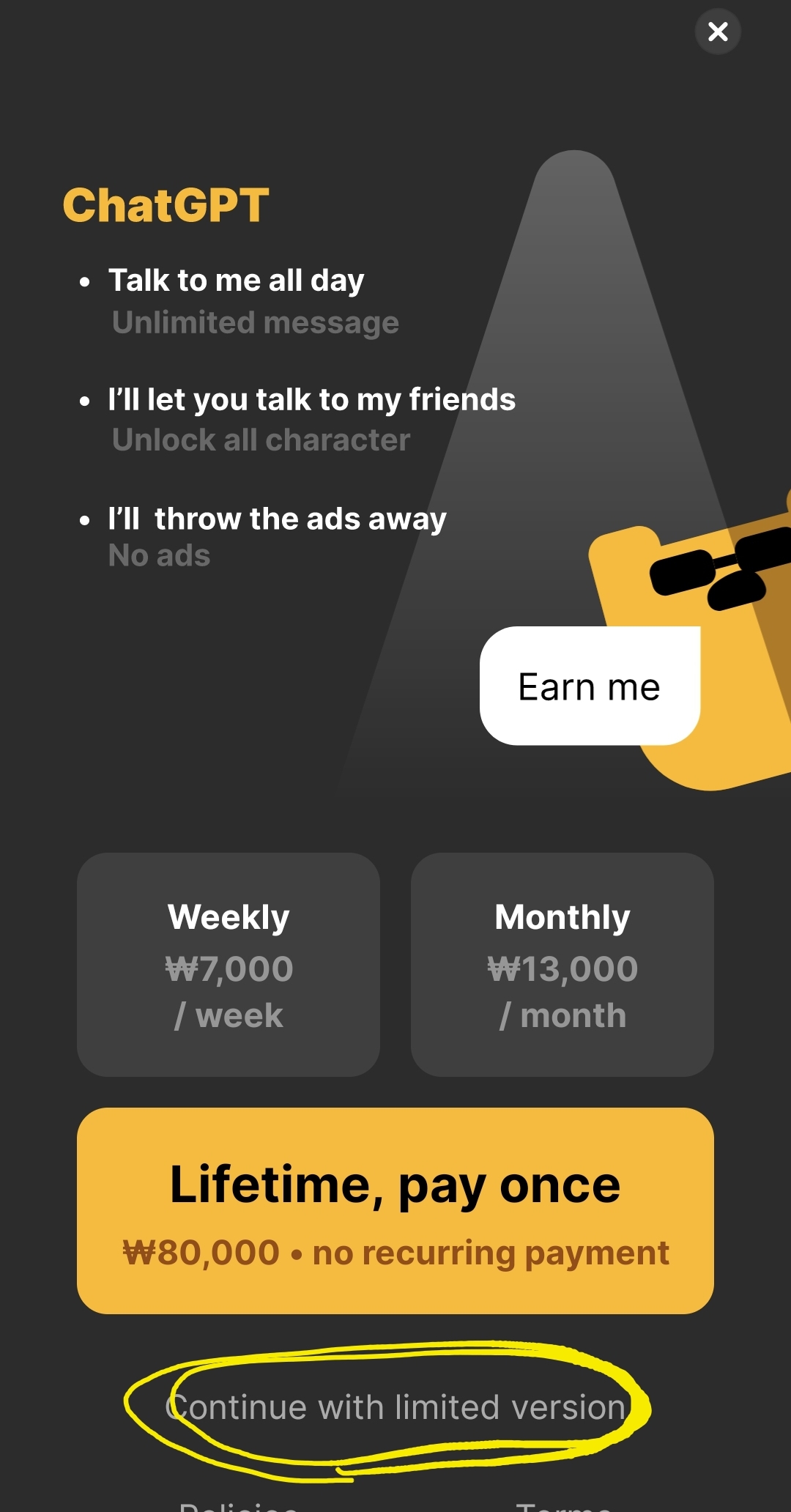 모든 어플에서 질문 횟수를 3회로 제한하고 있습니다. 오픈 AI에서 만든 프로그램에서는 질문 횟수 제한이 없는 것과 대조적입니다. 질문 회수가 끝나면 유료버전을 결제하거나 광고를 시청해야 합니다.