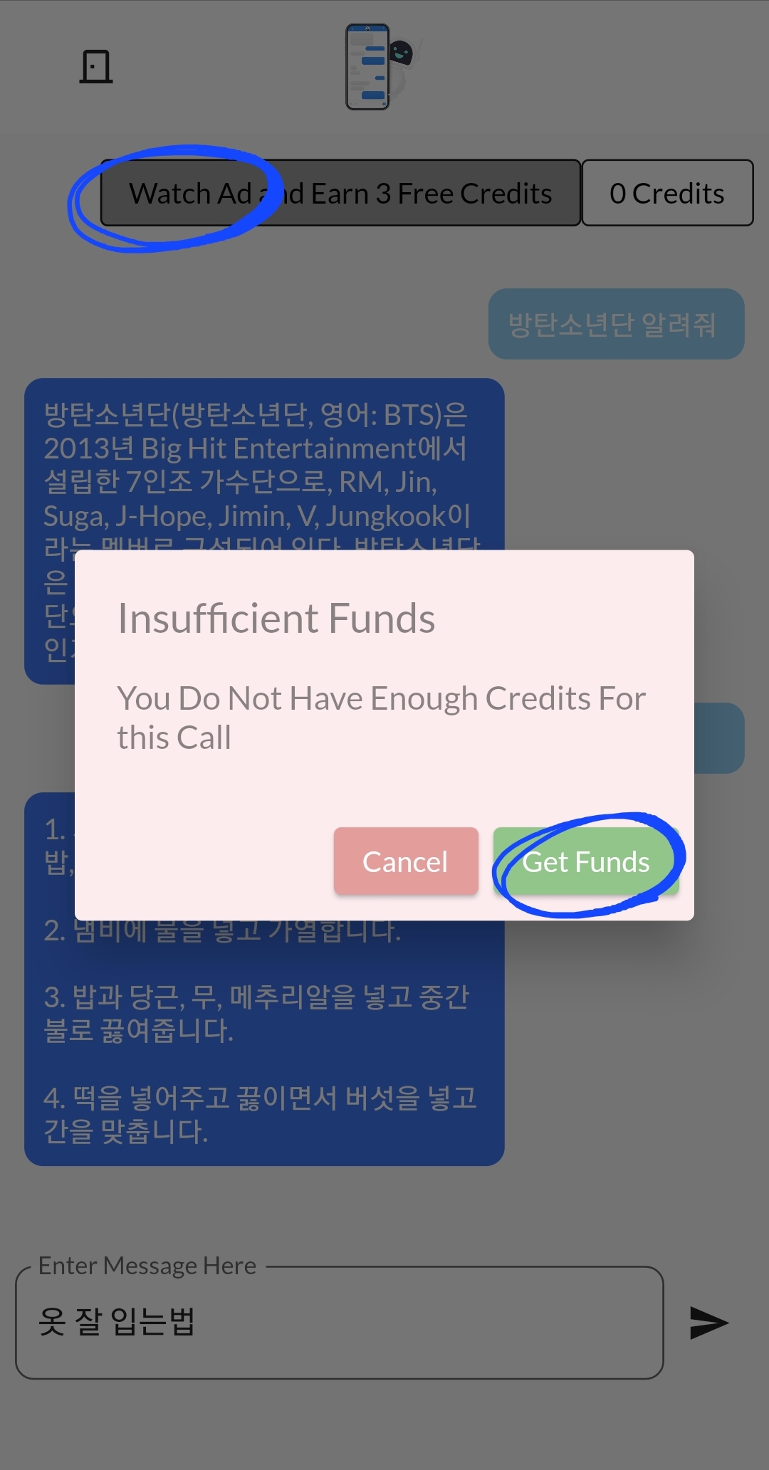두 번째 단점은 질문 횟수에 제한이 있다는 점입니다. 처음 로그인을 하면 3번 질문을 할 수 있습니다. 3번 질문이 끝나면 후원하거나 광고를 시청하셔서 크레딧을 받아야 합니다. 크레딧 한 개당 질문 한 개를 할 수 있습니다.