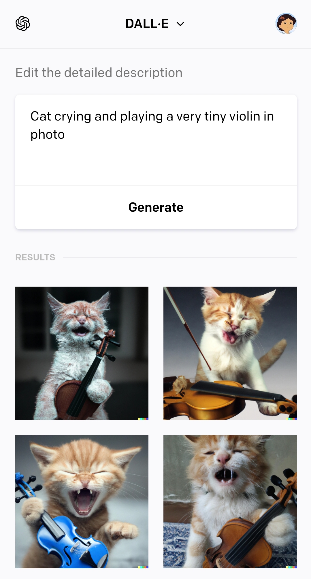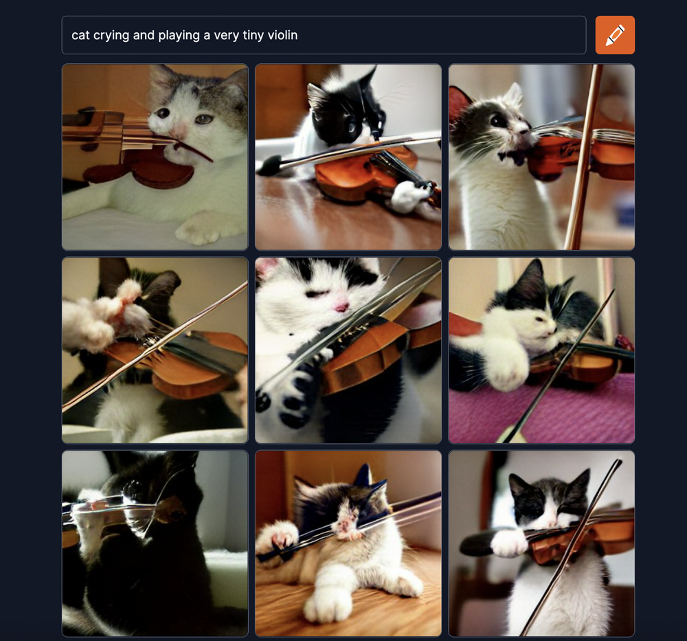 예를 들어서 "울고 있는 고양이가 작은 바이올린을 연주하는데 그림"이라고 적으면 다음과 같이 그대로 그림을 그려 줍니다.